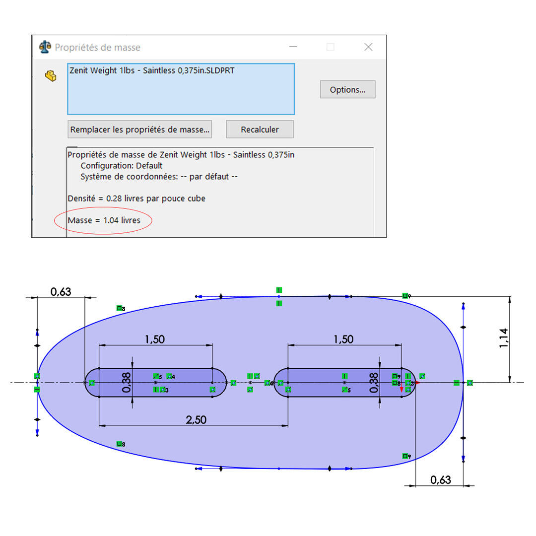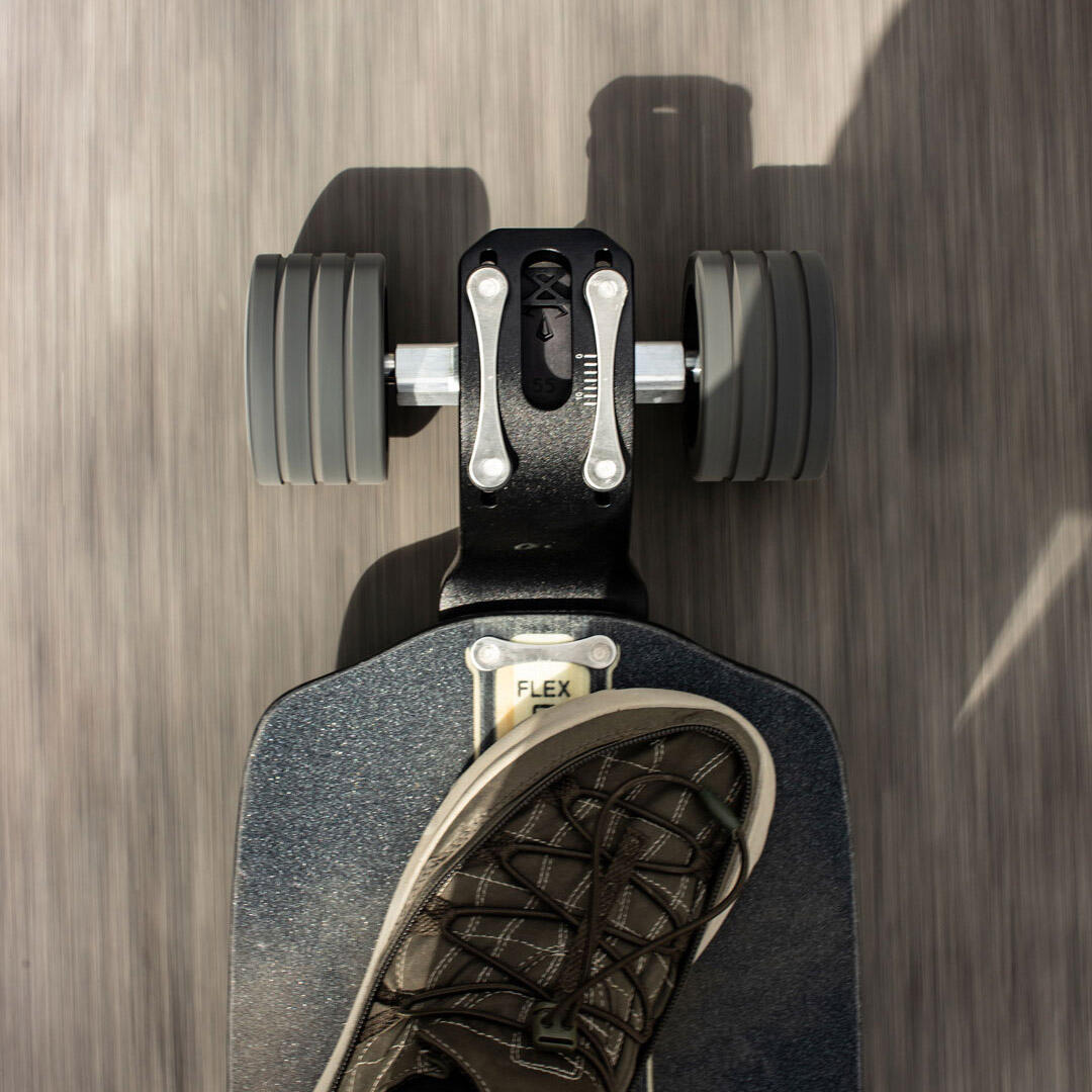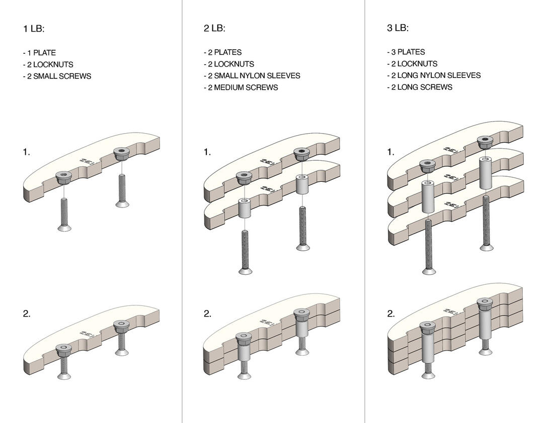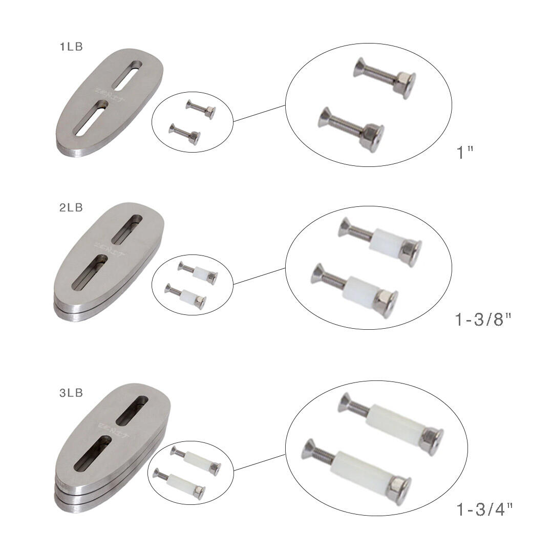 Le choix de 1, 2 ou 3 lb et de leur position est possible grâce au système modulaire, ce qui permet de tester facilement différentes combinaisons et de trouver celle qui convient le mieux à l'utilisateur. Ces ajustements ont un impact important sur la maniabilité de la planche.Les trous oblongs permettent un ajustement de 1 1/2 pouce vers l'avant ou vers l'arrière de la planche. Le centre de gravité est grandement affecté par la position du poids, et il est important de pouvoir ajuster cette position sans avoir à percer plusieurs trous dans la planche.