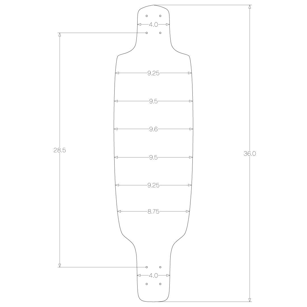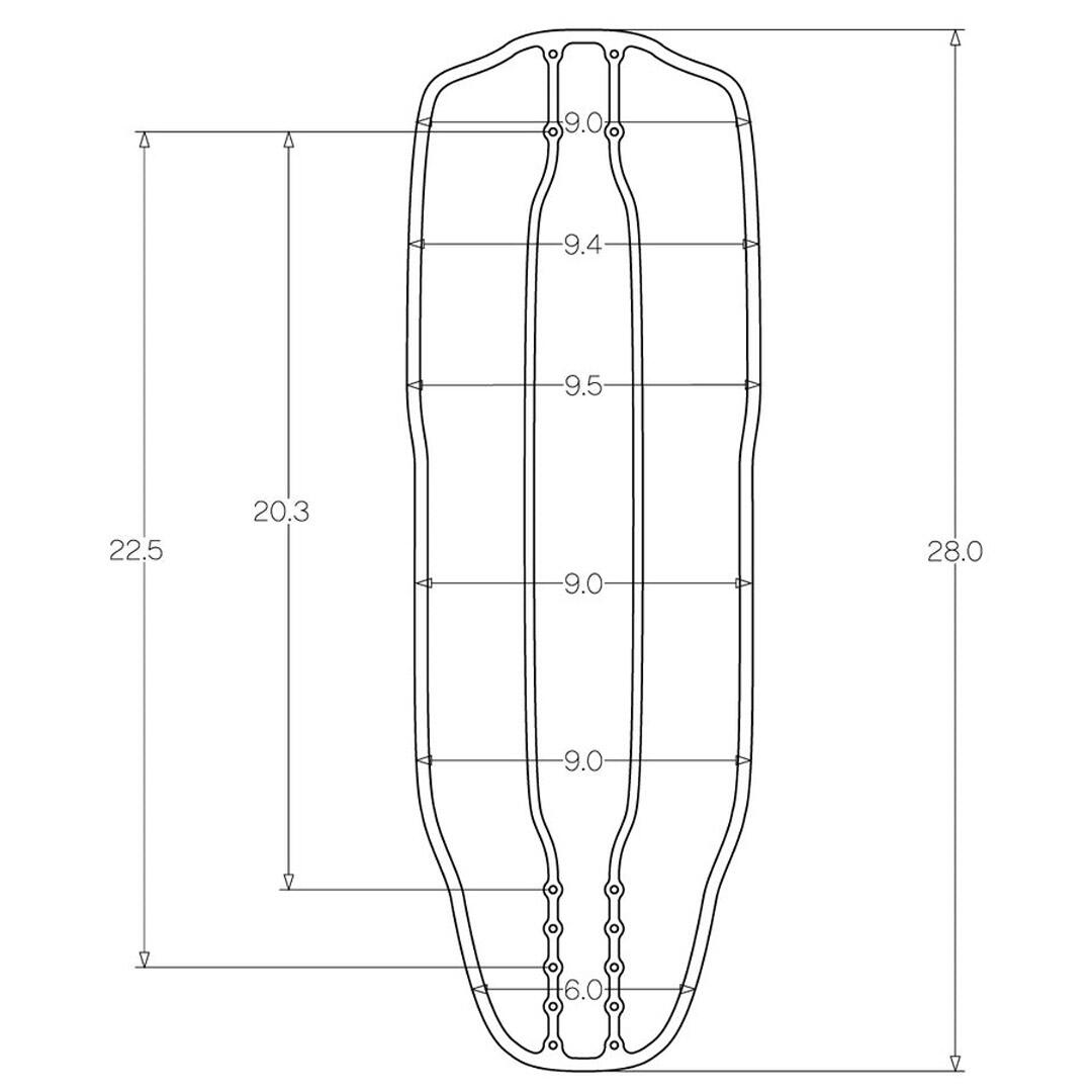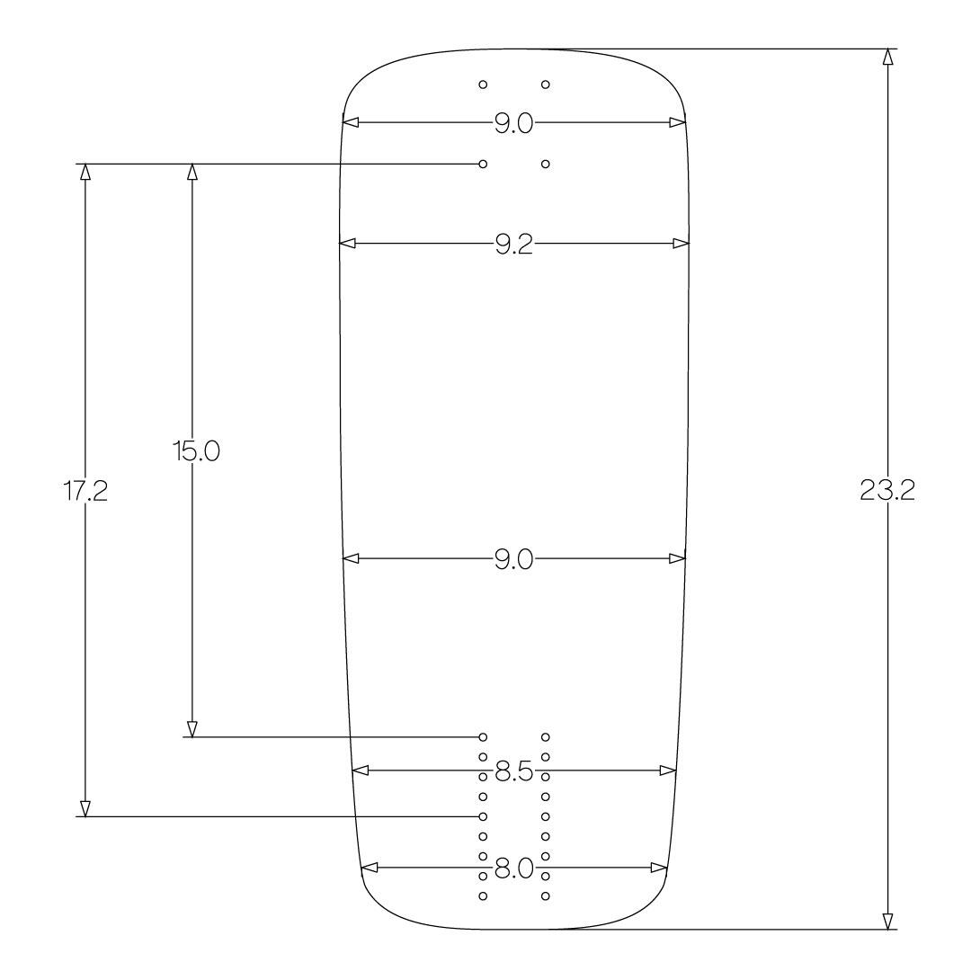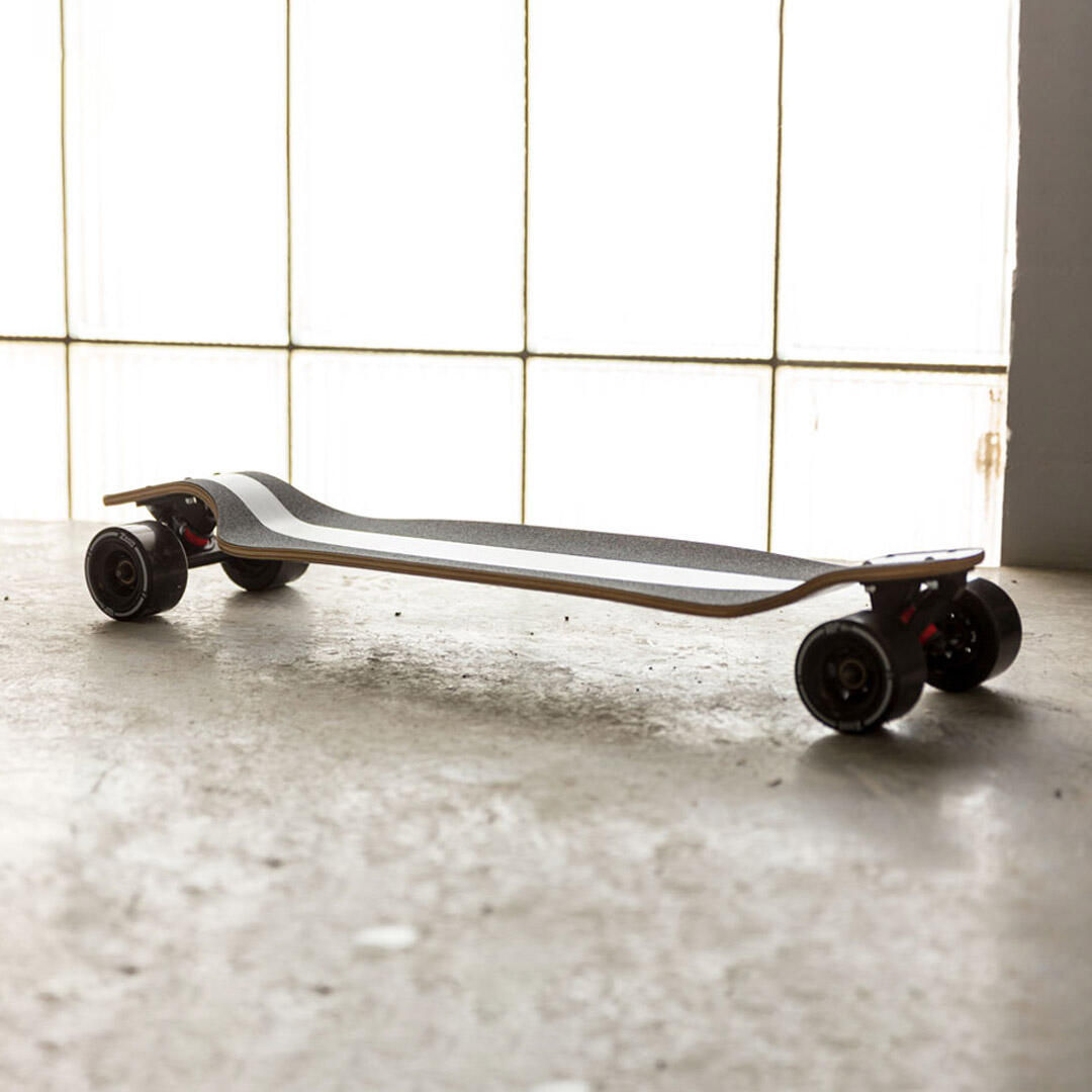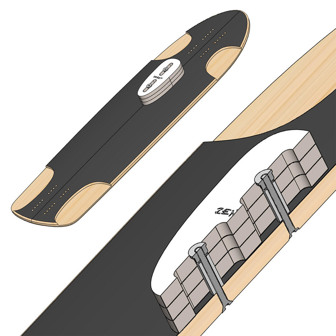 Une longueur de 28 pouces offre assez d'espace pour alterner le pied utilisé pour la poussée, ce qui réduit l'épuisement pendant de longues distances. À l'emplacement des pieds, une largeur de 9 pouces permet un bon contrôle sur les côtés de la planche sans être encombrante lors de la poussée. L'optimisation de la forme et des dimensions permet de réduire significativement le poids de la planche.