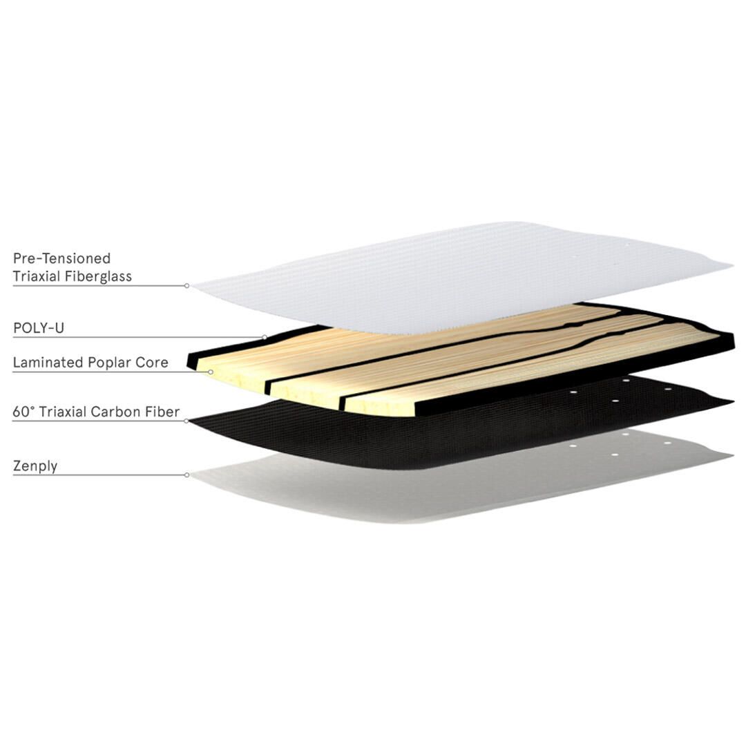 Les fibres triaxiales permettent de rigidifier la planche en longueur et en torsion. De plus, elles augmentent considérablement la valeur perçue du produit.Lors du planage, l'épaisseur du noyau est ajustée pour offrir plusieurs options de rigidité, ce qui peut répondre à un plus grand nombre d'utilisateurs.