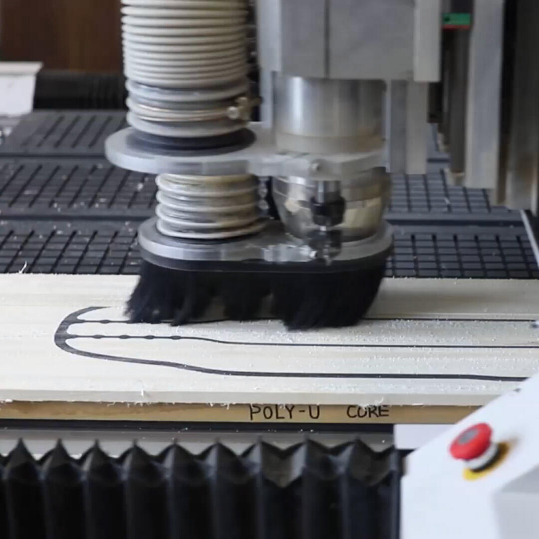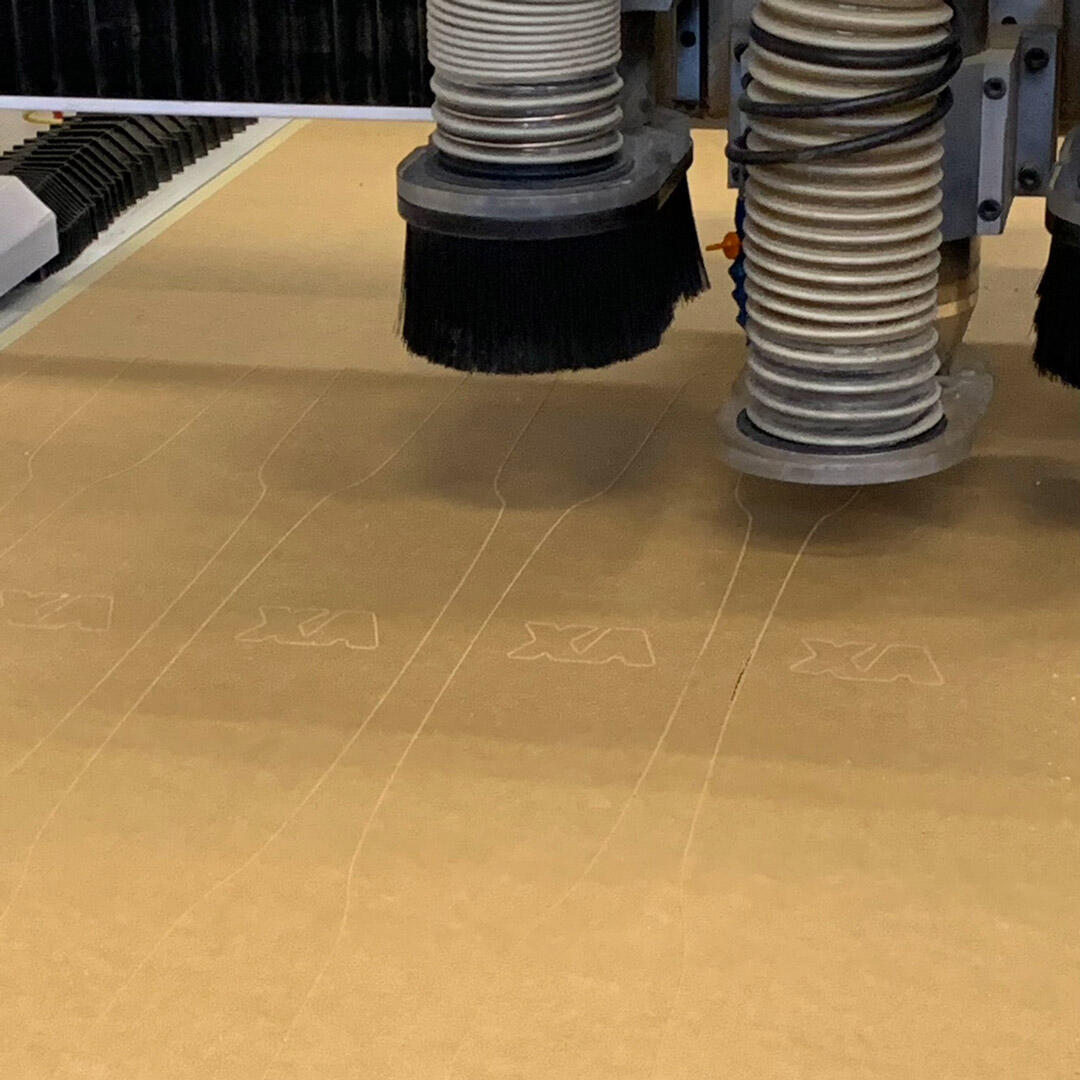 La découpe du plaquage de noyer est réalisée sur la CNC pour assurer une précision optimale. Grâce au logiciel Vectric, les découpes sont optimisées pour éviter le gaspillage. Ensuite, la programmation de la CNC est effectuée grâce aux dessins assistés par ordinateur.