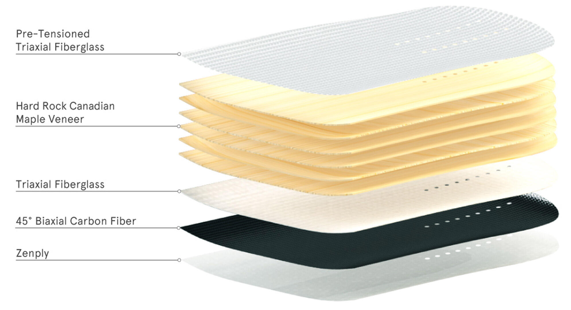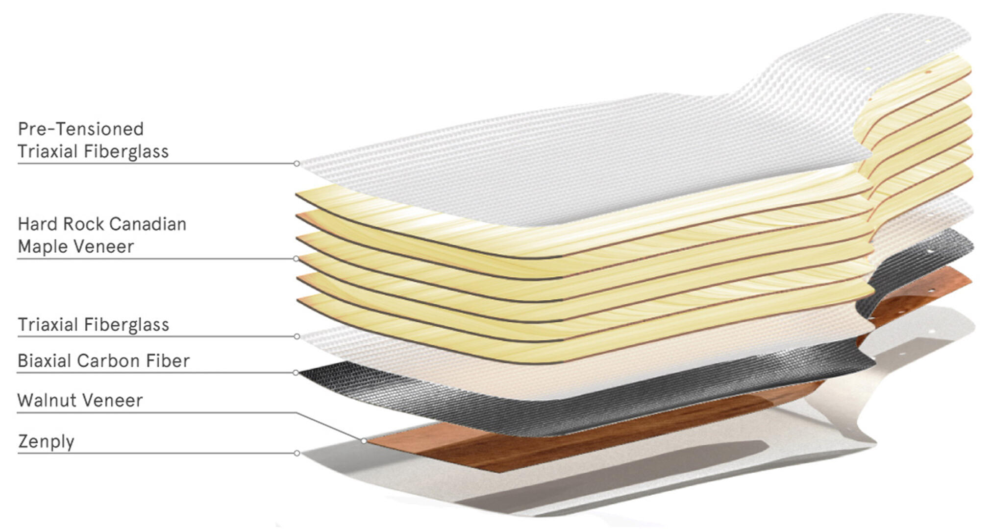 Le choix des matériaux composites est le fruit de plusieurs tests et prototypes visant à trouver la combinaison idéale, ce qui permet d'offrir le meilleur ratio de rigidité par rapport au poids. À l'aide d'une presse hydraulique, ces matériaux sont laminés dans le moule avec une résine époxy.Les fibres permettent de rigidifier la planche en longueur et en torsion. De plus, elles augmentent considérablement la valeur perçue du produit.